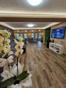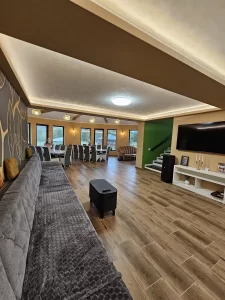 Living generos, cu zonă de luat masa, 2 Smart-TV, șemineu, boxa JBL
